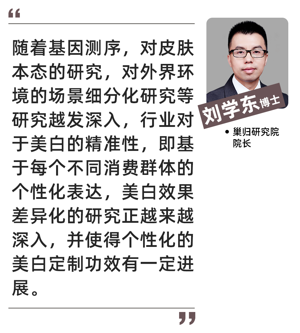 而若以更长期维度看,随着基因测序,对皮肤本态的研究,对外界环境的场景细分化研究等研究越发深入,刘学东也看到,行业对于美白的精准性,即基于每个不同消费群体的个性化表达,美白效果差异化的研究正越来越深入,并使得个性化的美白定制功效有一定进展。