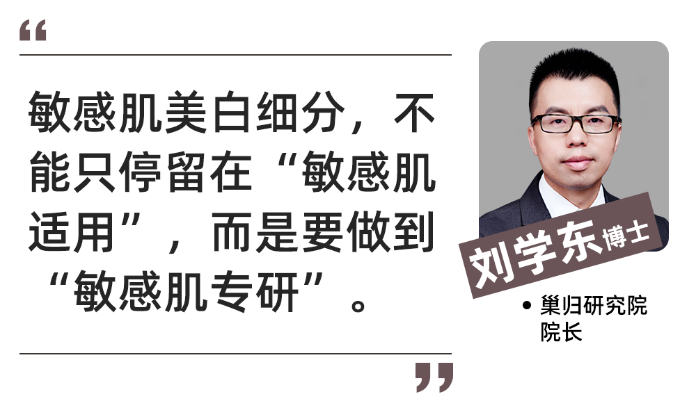对此,如巢归研究院院长刘学东博士就十分赞同,将敏感肌单独拎出去做。并且,他还补充建议道,其细分不能只停留在“敏感肌适用”,而是要做到“敏感肌专研”。