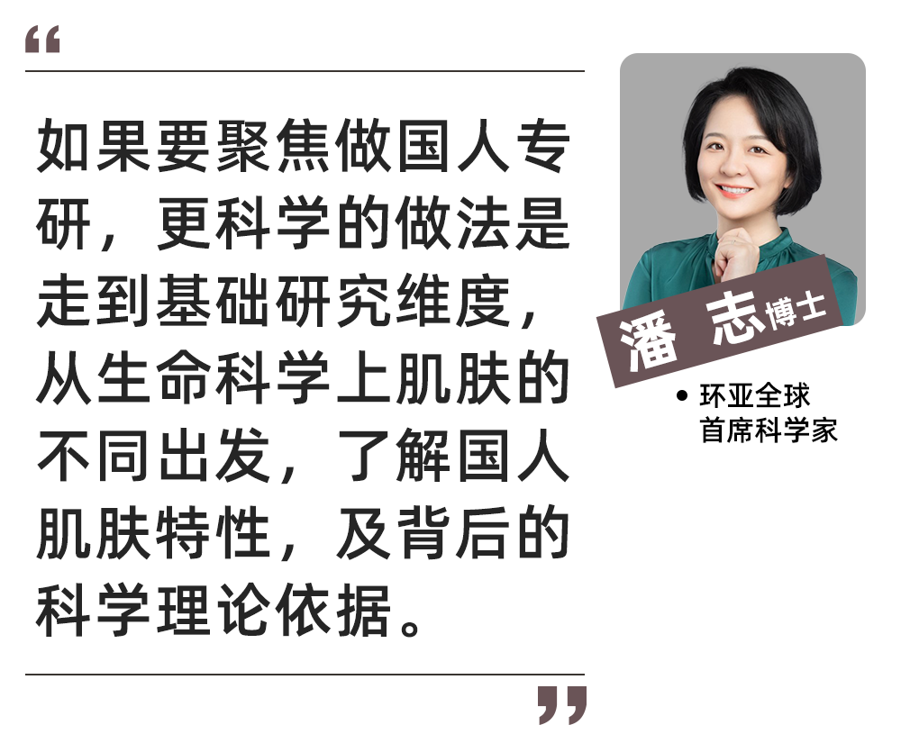 “如果要聚焦做国人专研,更科学的做法是走到基础研究维度,从生命科学上肌肤的不同出发,了解国人肌肤特性,及背后的科学理论依据。比如,对于最容易引起色沉的UV和炎症,国人和高加索人的肌肤是有不同的临床表现的,品牌在做的时候,就需要看到背后的分子机制差异,找到差异化解决方案,才能真正做出最适合国人的美白产品。”潘志继而补充道。