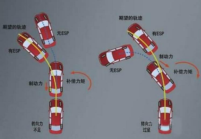 ESP可以使车辆在各种状况下保持最佳的稳定性,尤其在转向过度或转向不足的情形下效果更加明显。有ESP与只有ABS及ASR的汽车它们之间的差别在于,ABS及ASR只能被动地作出反应,而ESP则能够探测和分析车况并纠正驾驶的错误,防患于未然。ESP对过度转向或不足转向特别敏感,例如汽车在路滑时左拐过度转向(转弯太急)时会产生向右侧甩尾,传感器感觉到滑动就会迅速制动右前轮使其恢复附着力,产生一种相反的转矩而使汽车保持在原来的车道上。
