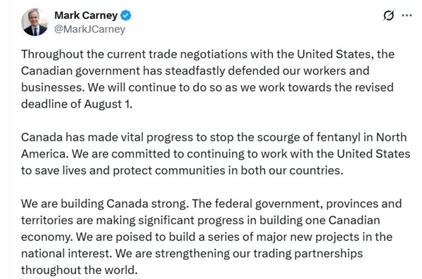 卡尼在社交媒体发文指出,在与美国的贸易谈判中,加拿大政府一直坚定维护本国工人和企业的利益。加拿大将保持该原则并在8月1日截止日前继续谈判。