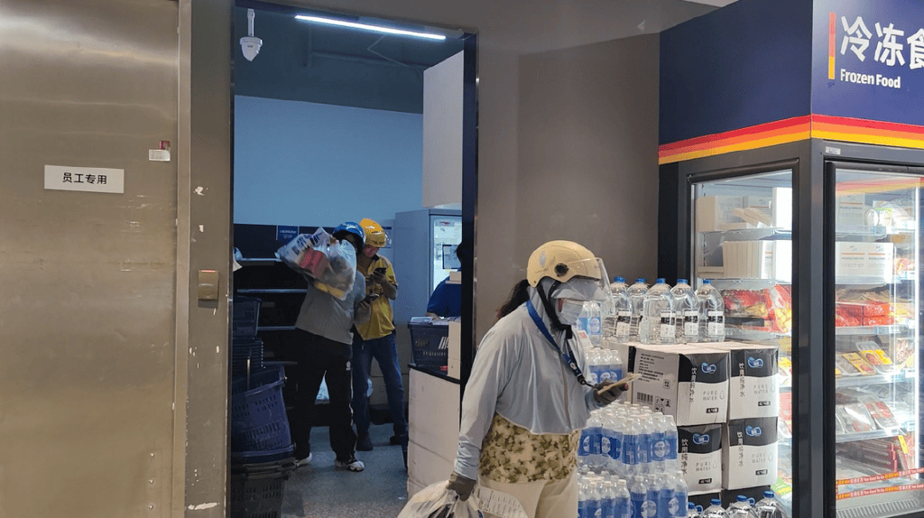更直观的景象是店里往来穿梭的外卖骑手。超市门口,身着蓝、黄、红各色工服的骑手们不停进出;超市出货仓更是排起了小长队,骑手们在出货架上仔细核对订单编号,一位达达骑手甚至推来两辆小推车,显然是为多单配送做足了准备。