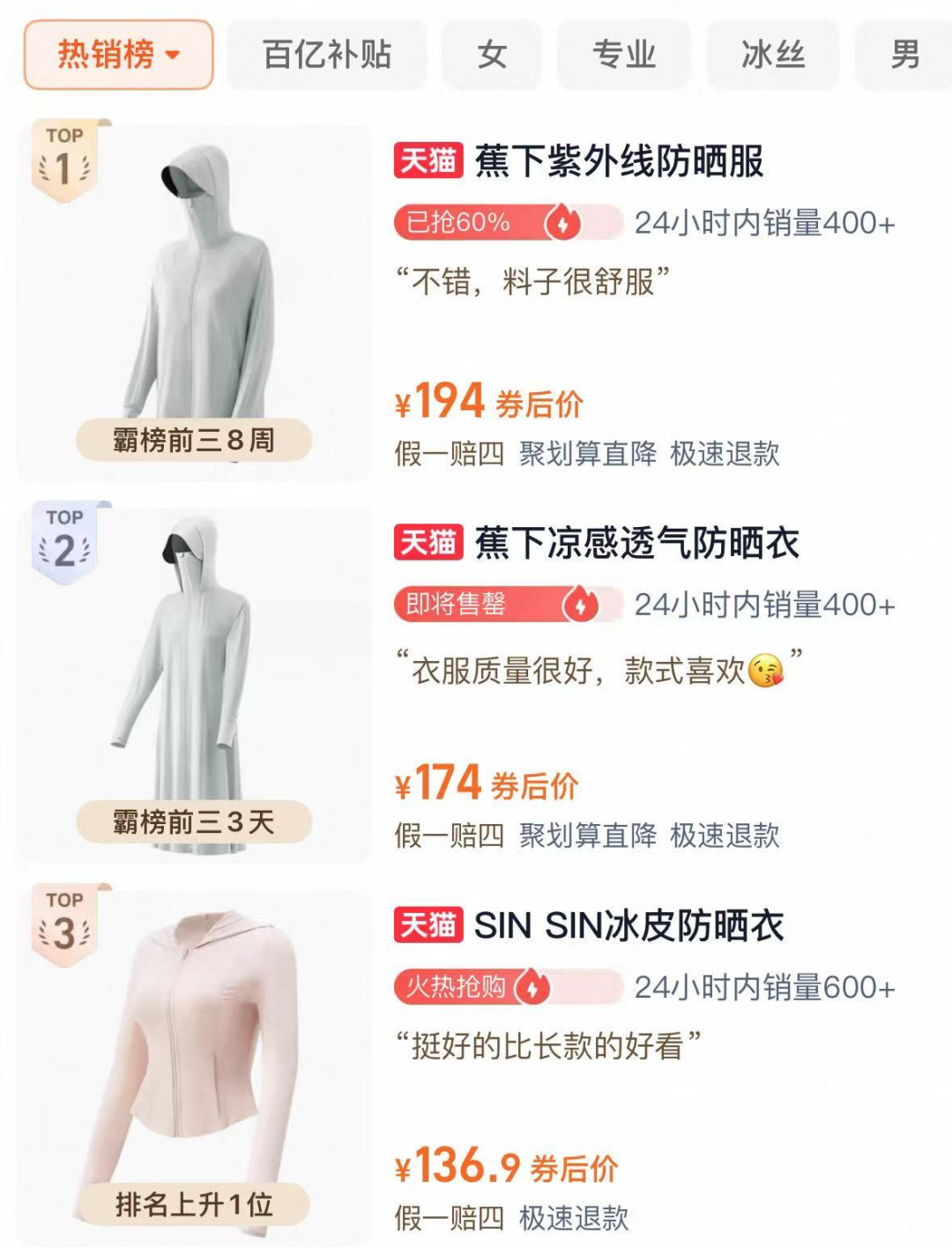 今年天猫防晒服热销榜单的前五名中,蕉下的产品占了3个席位,并且排名第一的蕉下防晒服已经霸榜前三8周;在刚刚结束的天猫618的服饰销售榜中,除了优衣库、UR、ZARA“三巨头”之外,蕉下和蕉内分列三、四名。