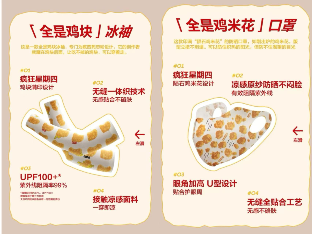 近期,蕉内与肯德基联名,购买“疯狂星期四”指定产品便可获得“全是鸡块”冰袖和“全是鸡米花”口罩。