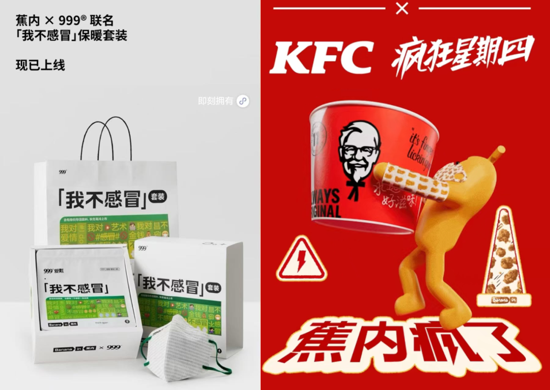 此次与肯德基联名作出的冰袖和口罩套餐,在宣传时打出的“疯搭子”口号,就是十分贴合当下情绪的一次内容营销,相似的策略被蕉内用在了盒马、太二酸菜鱼以及999感冒灵的联名中。