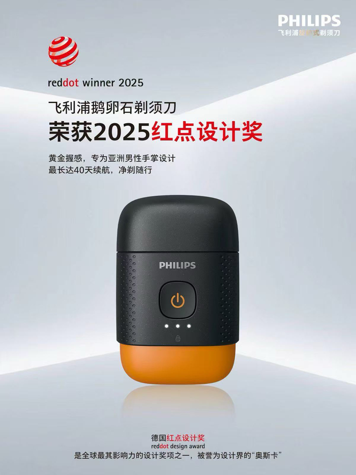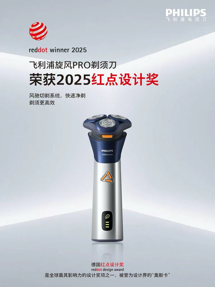 2025年7月11日——被誉为“设计界的奥斯卡”、全球三大设计奖之一的德国红点设计奖近日揭晓2025年获奖名单,飞利浦集团荣获共52个奖项。其中飞利浦健康科技明星产品飞利浦旋护式新 9 系剃须刀、飞利浦鹅卵石便携剃须刀、飞利浦旋风 Pro 剃须刀获得国际权威认可,从上万件参评作品中脱颖而出。飞利浦旋护式新9系剃须刀更摘得红点奖最高荣誉——“最佳设计奖”(Best of the Best),成为本年度个人护理类唯一获此荣誉的剃须刀产品。该荣誉仅授予同类别中最具突破性与设计力的产品,获奖比例不足1%,可谓是“百里挑一”。“极具共鸣性的设计思维是飞利浦设计理念的核心,”飞利浦设计总监Peter Skillman表示,“我们不仅关注实用美观,更希望每件产品都能为消费者创造价值和意义。”