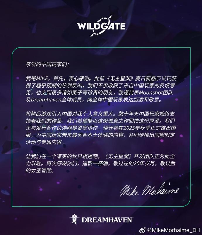 7月11日晚间,美国Dreamhaven公司CEO麦克·莫汉(Mike Morhaime)在微博发布致中国玩家的一封信。信中称,公司正与发行合作伙伴网易紧密协作,《无主星渊》预计将在2025年秋季正式推出国服,并同步推出国服限定活动与专属内容。《无主星渊》是由Dreamhaven公司旗下Moonshot工作室开发,由网易代理的首款星际飞船团队射击游戏。