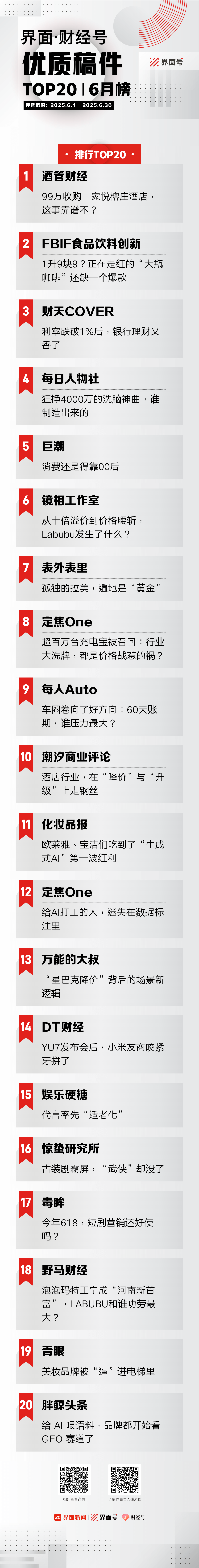 行走烟火人间,穿越四季光阴,界面·财经号1000多位成员立足于现实生活,持续观察千姿百态的商业现象,破解商业世界背后的秘密,在2025年6月1日至6月30日期间累计发文近2000篇。其中,以下20篇稿件脱颖而出,荣登《界面·财经号优质稿件TOP20|2025年6月榜》,用原创彰显独立思考的力量。