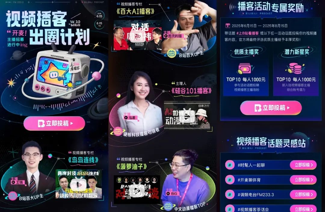 “视频播客出圈计划”推出,B站承诺千万流量扶持、AI剪辑工具和城市录播棚支持,旨在将原本属于耳朵的“播客”内容,也呈现在屏幕之前。这不是B站第一次试图改写内容生态,也不会是最后一次。