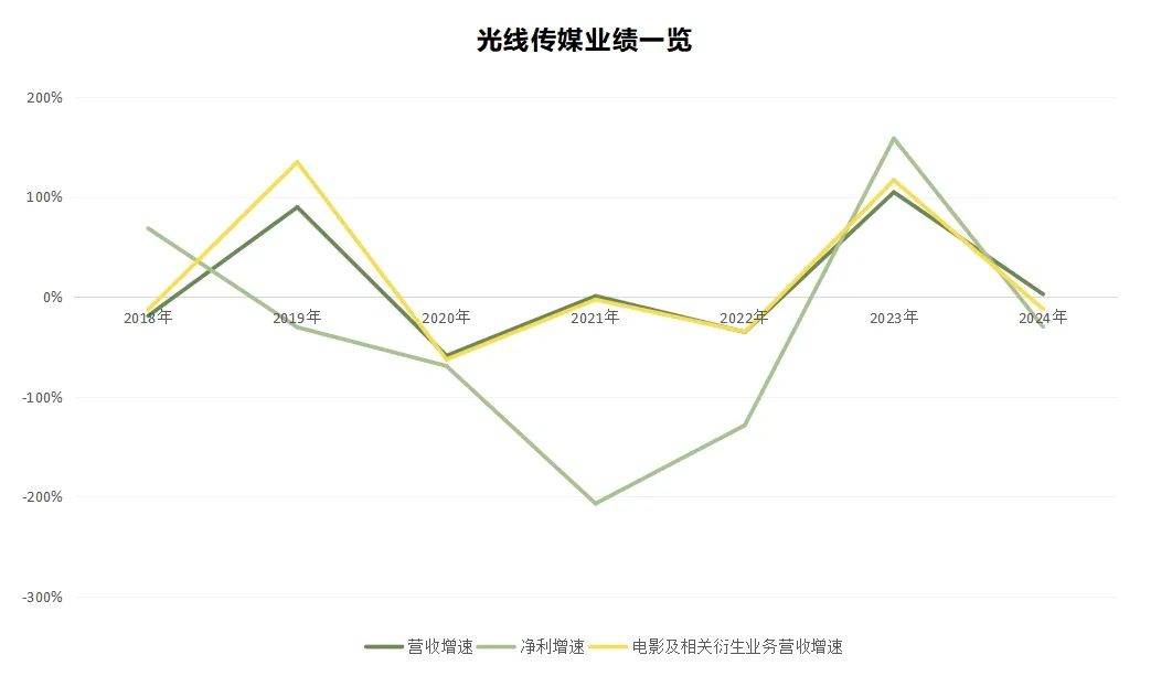 这的确是光线传媒近几年较为突出的问题,翻阅财报可以发现,光线传媒的业绩自2018年以来便存在很大的波动——公司营收在2018年仅为14.92亿元,第二年便几乎翻倍达到28.29亿元,而疫情期间,光线传媒营收、净利等指标的变动幅度多次超过100%;营收占比在70%以上的电影及相关衍生业务,业绩不稳定则更加明显:2018年以来的7年中,有三年营收变动幅度超过了60%,毛利率也曾在三年内由最高59.87%下降至13.13%。