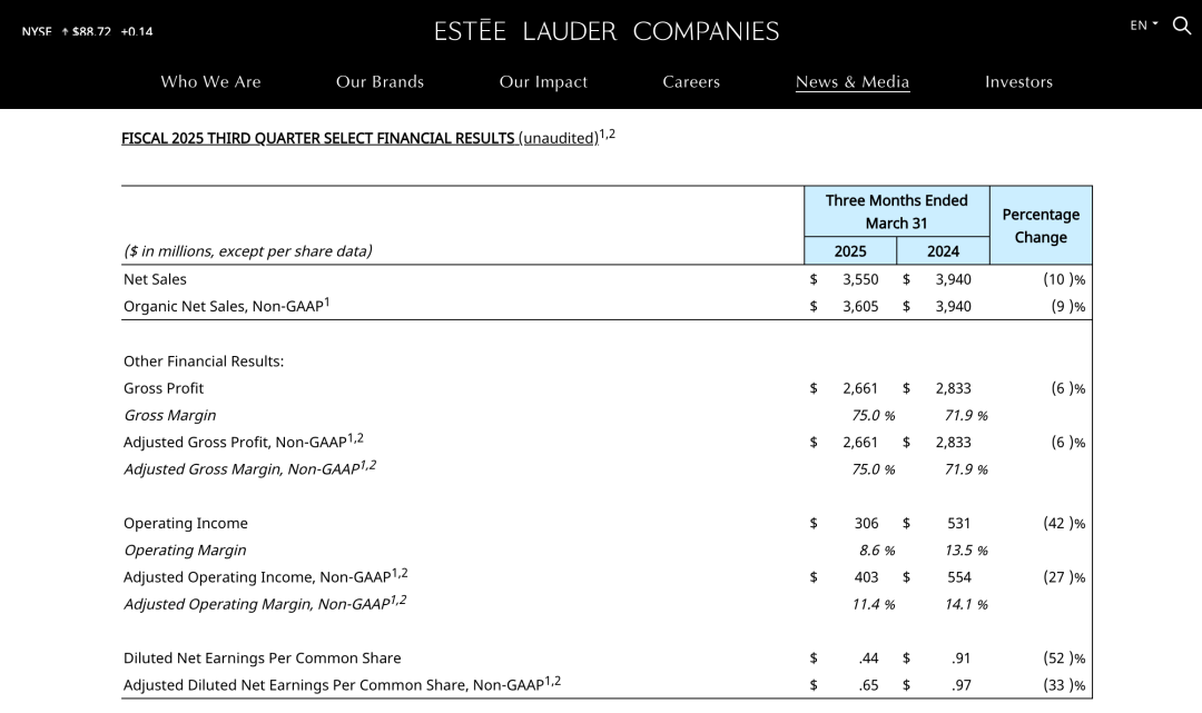 雅诗兰黛2025财年第三季度财报