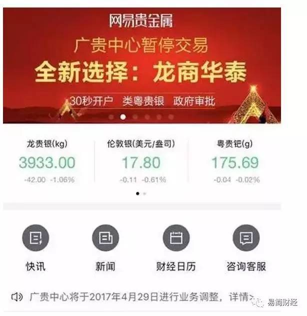 在广贵金中心发布交易业务调整通知的第二天,网易贵金属就将APP内原本广贵中心的广告图,换成了龙商华泰。