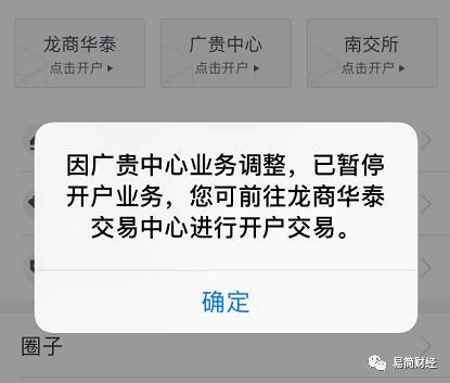 现在,简小编打开网易贵金属APP,依然可以进行开户交易。不过若选择在广贵中心开户,就会提示“因广贵中心业务调整,已暂停开户业务,您可前往龙商华泰交易中心进行开会交易”,点击确定后,还会弹出广贵中心业务调整的公告。