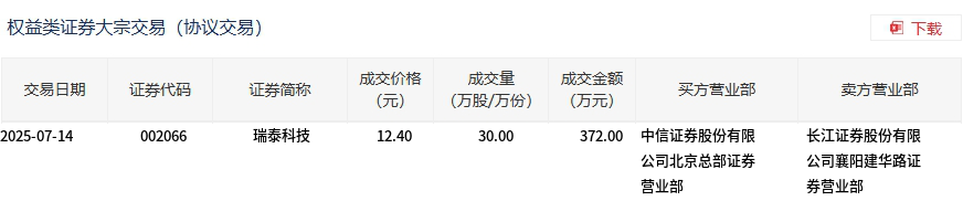 7月14日,瑞泰科技大宗交易成交30万股,成交额372万元,占当日总成交额的4.3%,成交价12.4元,较市场收盘价12.67元折价2.13%。