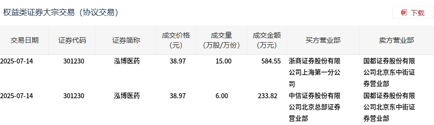 7月14日,泓博医药大宗交易成交21万股,成交额818.37万元,占当日总成交额的1.23%,成交价38.97元,较市场收盘价39.44元折价1.19%。