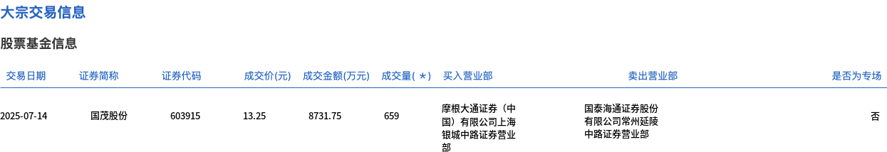 7月14日,国茂股份大宗交易成交659万股,成交额8731.75万元,占当日总成交额的18.59%,成交价13.25元,较市场收盘价15.06元折价12.02%。