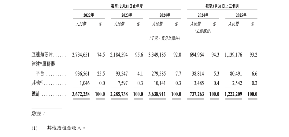 招股书显示,2022-2024年及2025年第一季度(下称:报告期),澜起科技来自互连类芯片的收入分别约27.35亿、21.85亿、33.49亿、11.39亿元,占营收的比例分别为74.5%、95.6%、92.0%、93.2%;来自津逮 服务器平台的收入分别约9.37亿、9354.7万、2.80亿、8049.1万元,占比分别为25.5%、4.1%、7.7%、6.6%。