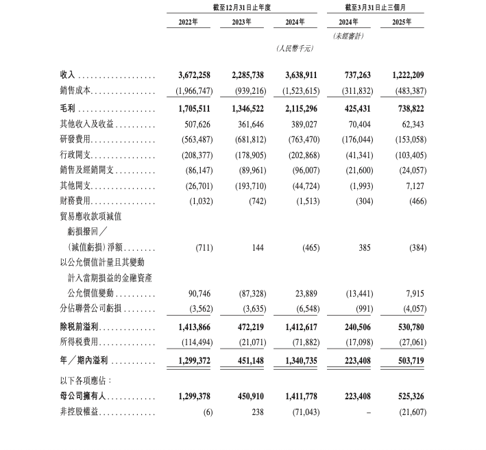 报告期内,澜起科技的营业收入分别约36.72亿、22.86亿、36.39亿、12.22亿元;毛利分别约17.06亿、13.47亿、21.15亿、7.39亿元,毛利率分别为46.4%、58.9%、58.1%、60.4%;净利润分别约12.99亿、4.51亿、13.41亿、5.04亿元;经调整净利润分别约14.51亿、5.74亿、14.00亿、5.94亿元,经调整净利率分别为39.5%、25.1%、38.5%、48.6%。