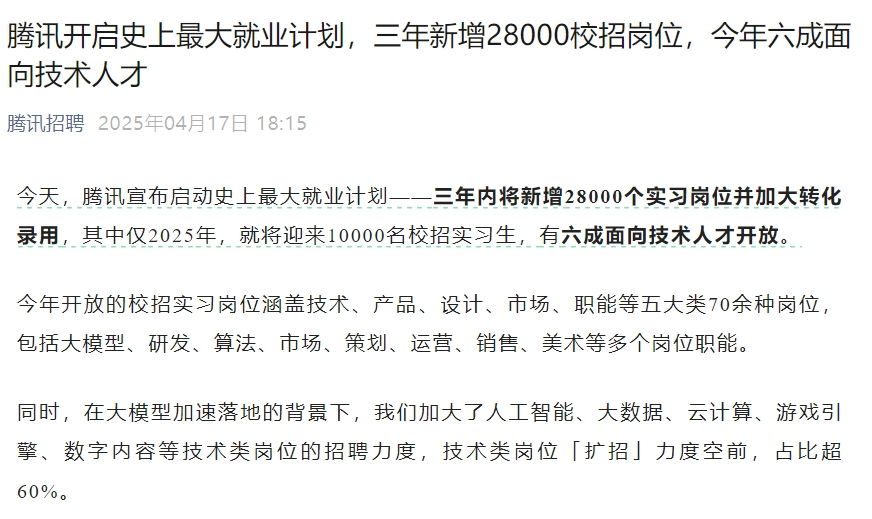 腾讯同样开启了规模空前的校招计划,将在三年内新增28000个校招实习岗位,2025年将迎来10000名校招实习生,其中技术类占比高达六成。