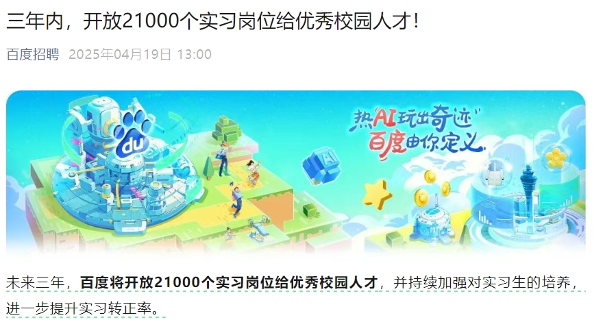 这只是其更大版图的一部分。未来三年,百度将开放21000个实习岗位给优秀校园人才,并持续加强对实习生的培养与转正机制。