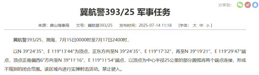 据中国海事局网站消息,唐山海事局发布航行警告,7月15日0时至7月17日24时,渤海部分海域进行实弹射击活动,禁止驶入。
