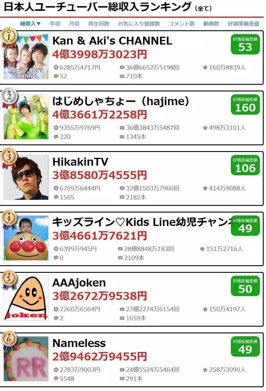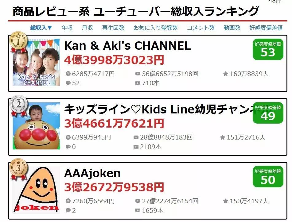 日本商品评测系YouTube频道收入榜单,前三位都是面向幼儿的频道