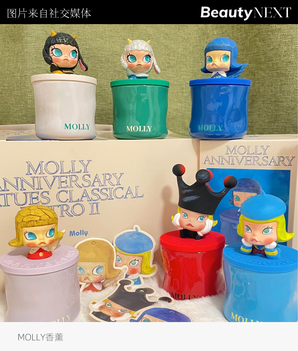 相较而言,家居香氛品类似乎更精准地击中了IP粉丝的情感需求。泡泡玛特相继为Molly、小野、LABUBU等核心IP量身打造的自有香薰产品线——从造型设计到香型调配,都深度结合各个IP的个性特征,甚至延续了标志性的盲盒销售模式。