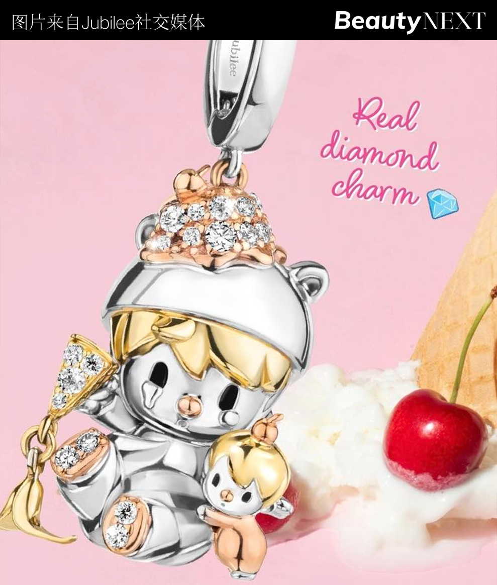 这是泡泡玛特首次涉足自主设计生产的首饰、珠宝领域。此前,泡泡玛特主要通过联名合作试水珠宝市场——其曾与本土品牌周生生合作推出以Molly和Dimoo为原型的黄金饰品系列;国际上,也曾和泰国的珠宝品牌Jubilee Diamond、PavIPa合作。