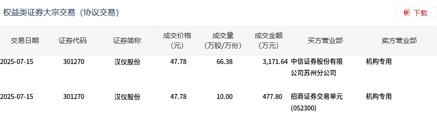 7月15日,汉仪股份大宗交易成交76.38万股,成交额3649.44万元,占当日总成交额的19.43%,成交价47.78元,较市场收盘价47.78元持平。