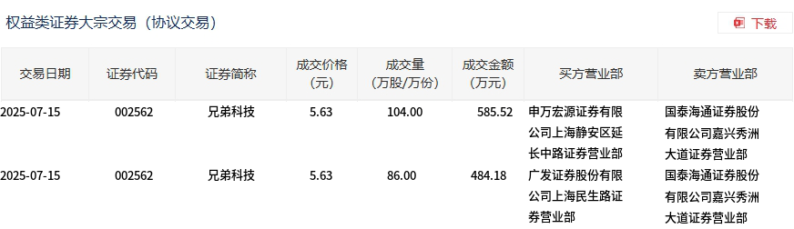 7月15日,兄弟科技大宗交易成交190万股,成交额1069.7万元,占当日总成交额的0.53%,成交价5.63元,较市场收盘价6.51元折价13.52%。