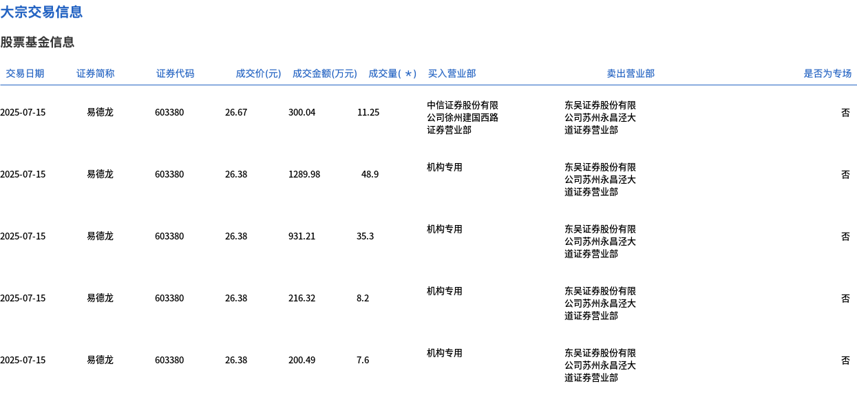 7月15日,易德龙大宗交易成交111.25万股,成交额2938.04万元,占当日总成交额的6.29%,成交均价26.41元,较市场收盘价30.5元折价13.41%,其中最高成交价26.67元,最低成交价26.38元。