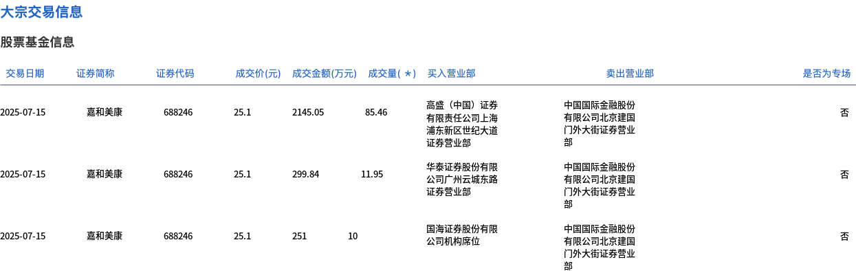 7月15日,嘉和美康大宗交易成交107.41万股,成交额2695.89万元,占当日总成交额的9.22%,成交价25.1元,较市场收盘价32.42元折价22.58%。
