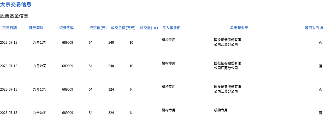 7月15日,九号公司大宗交易成交32万股,成交额1728万元,占当日总成交额的3.93%,成交价54元,较市场收盘价59.89元折价9.83%。
