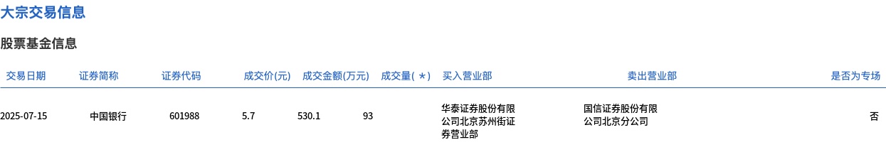 中国银行今日大宗交易平价成交93万股,成交额530.1万元