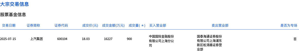 7月15日,上汽集团大宗交易成交900万股,成交额1.62亿元,占当日总成交额的9.54%,成交价18.03元,较市场收盘价18.21元折价0.99%。