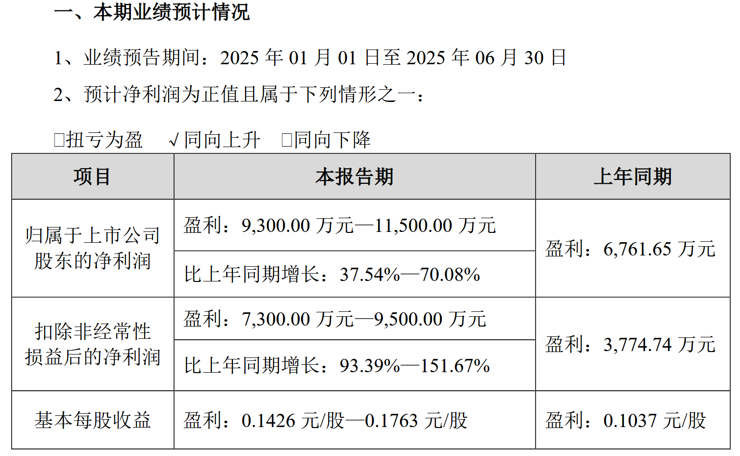 根据一季报,蓝黛科技在今年一季度实现营业收入和归母净利润分别同比增长24.51%和15.6%,但其扣非后归母净利润同比下降7.63%。综合一季报和2025年半年度业绩预告来看,蓝黛科技在今年二季度预计将实现归母净利润和扣非后归母净利润的同比大幅增长。