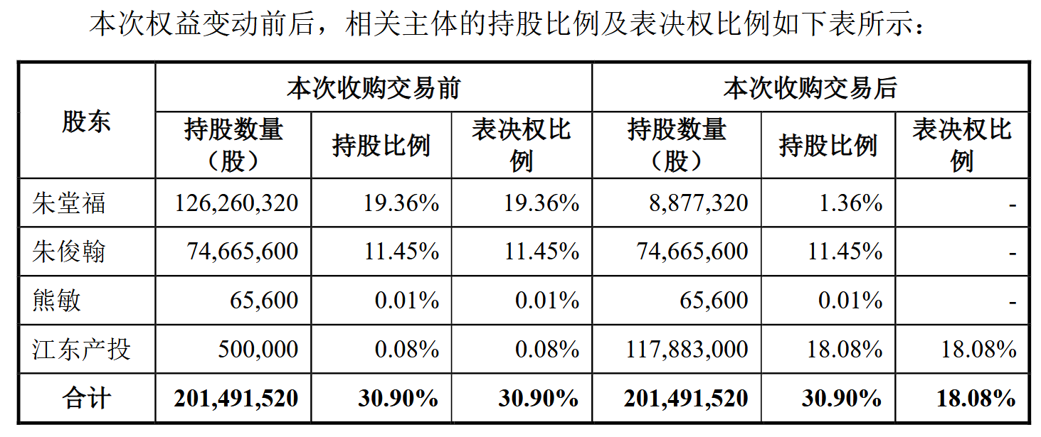近期,蓝黛科技还曾公告,实控人之一朱堂福拟向安徽江东产业投资集团有限公司(以下简称江东产投)转让所持公司总股本18%的股份,同时实控人朱堂福、熊敏、朱俊翰还将放弃行使所持有的蓝黛科技全部股份所对应的表决权,这将导致蓝黛科技控股股东变更为江东产投,公司实控人变更为马鞍山市人民政府。