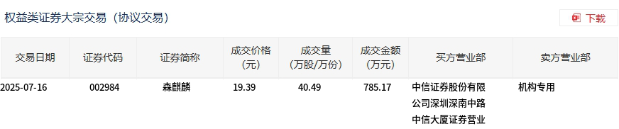 森麒麟今日大宗交易平价成交40.49万股,成交额785.17万元