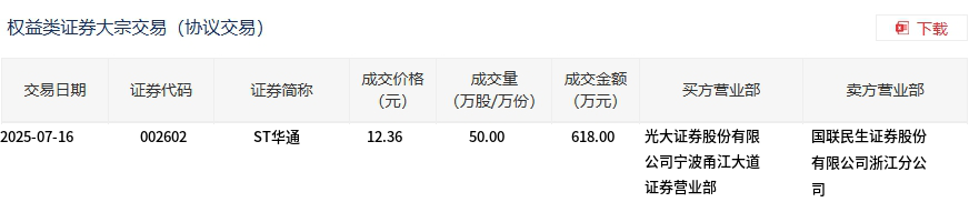 ST华通今日大宗交易平价成交50万股,成交额618万元