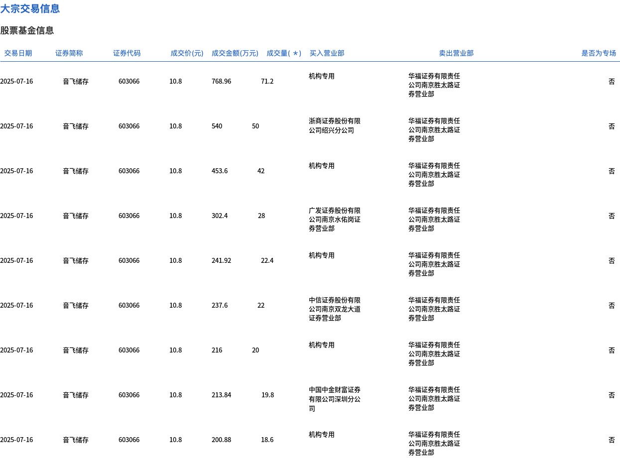 7月16日,音飞储存大宗交易成交294万股,成交额3175.2万元,占当日总成交额的30.25%,成交价10.8元,较市场收盘价12.19元折价11.4%。