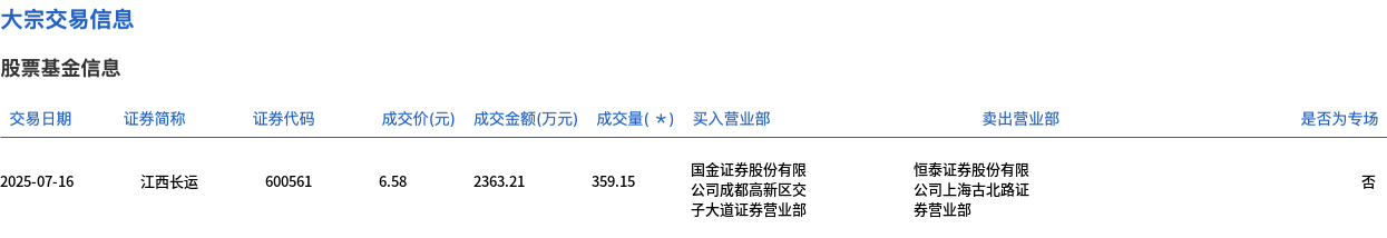 江西长运今日大宗交易平价成交359.15万股,成交额2363.21万元