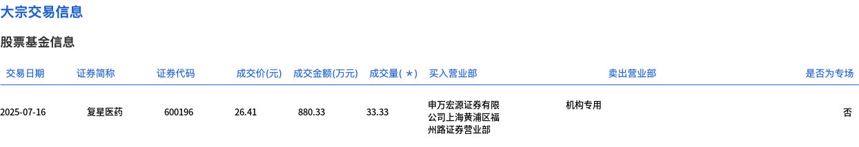 7月16日,复星医药大宗交易成交33.33万股,成交额880.33万元,占当日总成交额的0.69%,成交价26.41元,较市场收盘价26.41元持平。