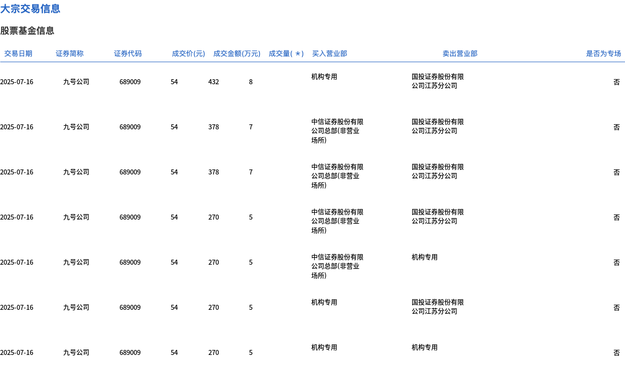7月16日,九号公司大宗交易成交42万股,成交额2268万元,占当日总成交额的6.04%,成交价54元,较市场收盘价59.1元折价8.63%。
