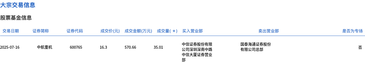7月16日,中航重机大宗交易成交35.01万股,成交额570.66万元,占当日总成交额的3.48%,成交价16.3元,较市场收盘价16.3元持平。
