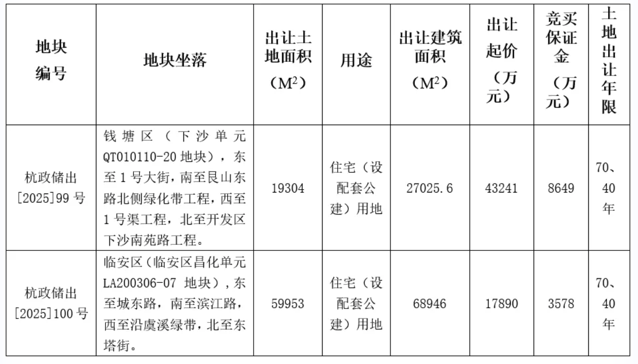 7月17日,杭州市规划和自然资源局发布杭州市国有建设用地使用权挂牌出让公告,将采用挂牌方式出让两宗地块,起始总价6.1131亿元,地块用途为住宅(设配套公建)用地,将于2025年8月9日正式挂牌出让。此次出让的两宗地块分别位于钱塘区和临安区,地块实行自由竞价,按照价高者得的原则确定竞得人。