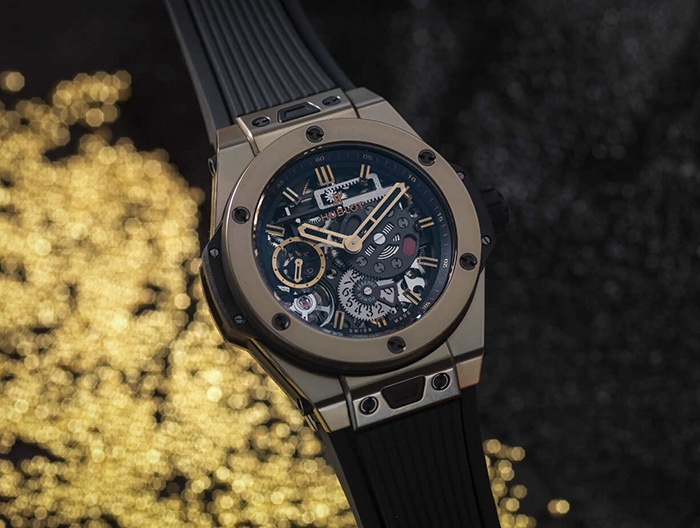由宇舶表团队独立研发的HUB1201自产机芯极具未来派风格,拥有223个零件以及两个平行发条盒,动力储存显示器以齿条结构为基础,可显示10天动力。