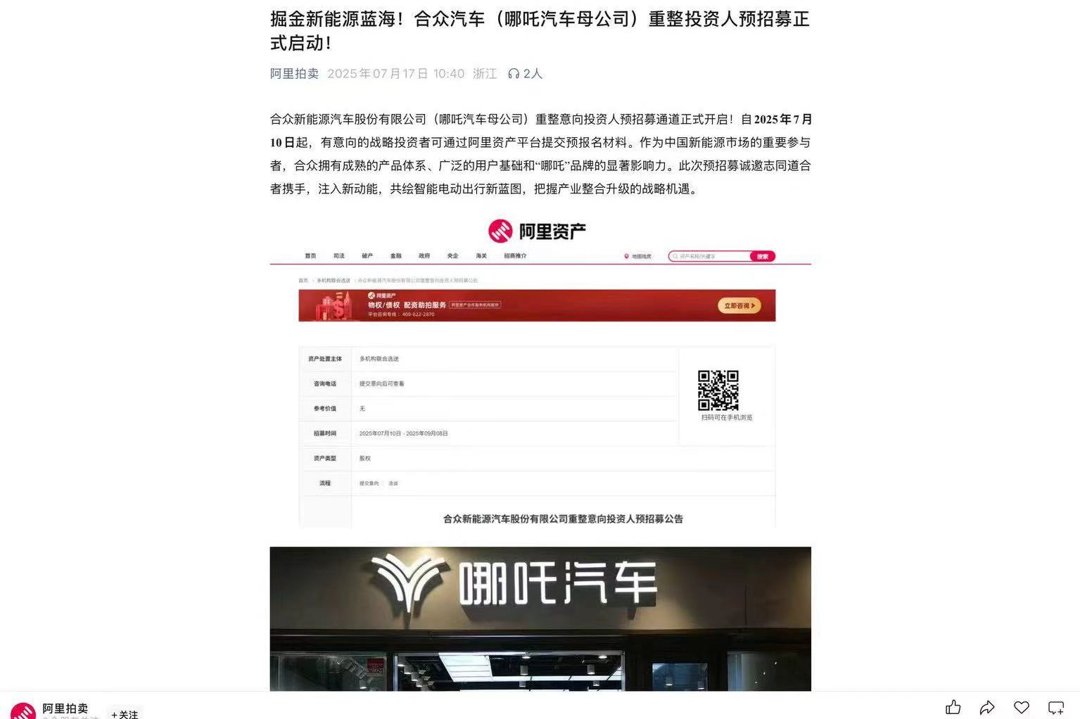 7月17日,据阿里资产消息,哪吒汽车母公司合众新能源汽车股份有限公司重整意向投资人预招募通道正式开启,自2025年7月10日起,有意向的战略投资者可通过阿里资产平台提交预报名材料。