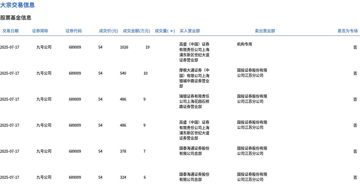 7月17日,九号公司大宗交易成交60万股,成交额3240万元,占当日总成交额的6.33%,成交价54元,较市场收盘价58.42元折价7.57%。