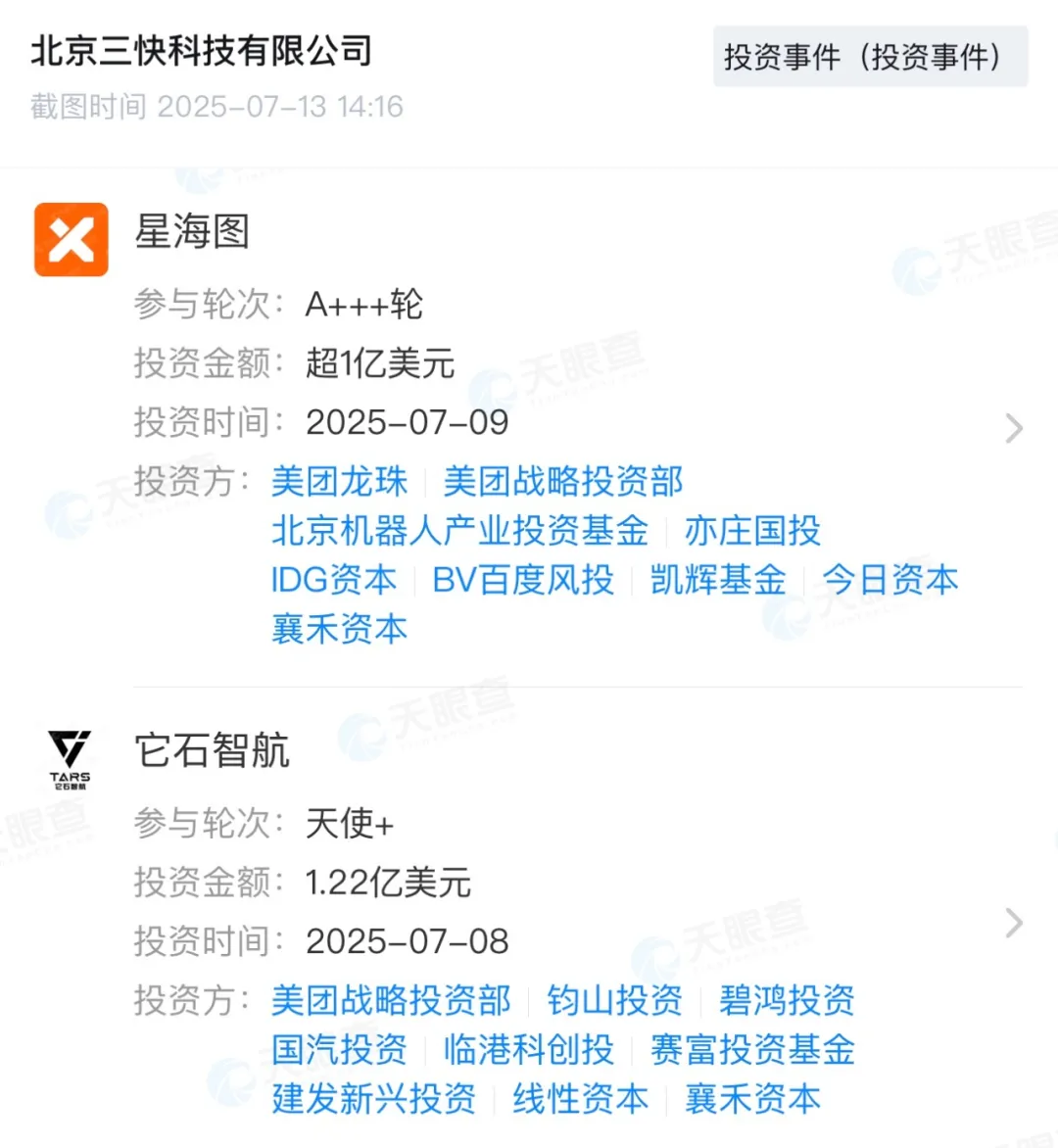 从实际上来看,美团对具身智能的投资也在加速。7月8日,美团战投出手,领投了具身智能初创公司它石智航的新一轮1.22亿美元融资。7月9日,美团再次出手,领投了星海图A4轮及A5轮战略融资,两轮合计融资金额超过1亿美元。