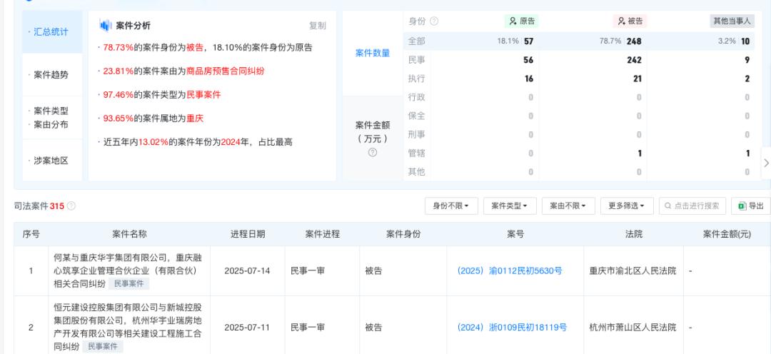 此外,据天眼查显示,重庆华宇当前所涉司法案件351件,78.73%的案件身份为被告;23.81%的涉案案由为商品房预售合同纠纷。